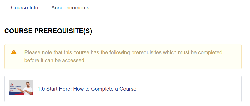 Click on a prerequisite course from the list under the ‘Course Info’ tab to complete any neccesary courses: